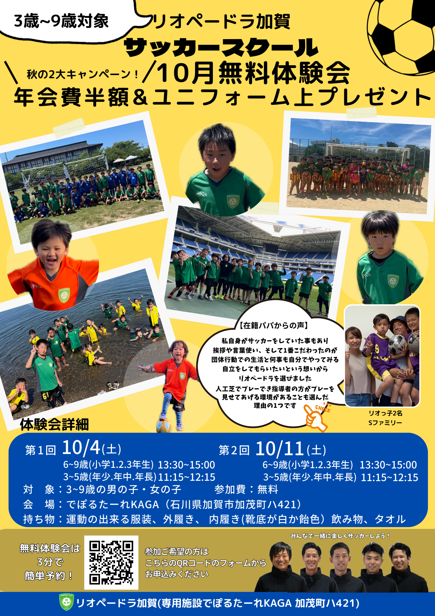2023/10/03下記の日程で3回無料体験会を開催致します! サッカーをやってみたい保育園、幼稚園児を大募集! ☆体験後入会で、年会費半額! 1 ...お知らせ
