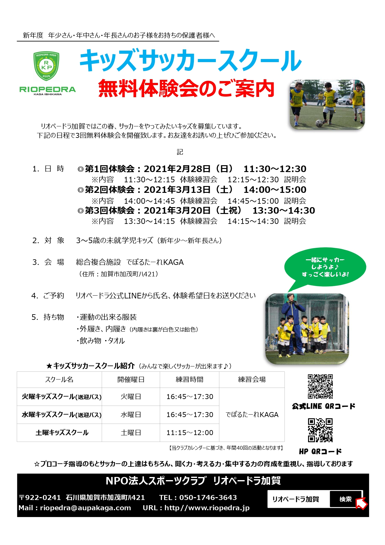 リオペードラ加賀ではサッカーをやってみたい保育園、幼稚園児を募集しています!